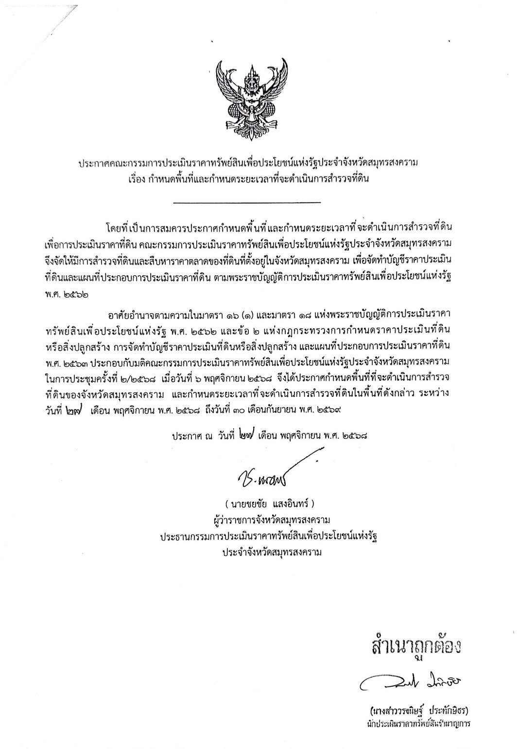 ประกาศคณะกรรมการประเมินราคาทรัพย์สินเพื่อประโยชน์แห่งรัฐประจำจังหวัดสมุทรสงคราม เรื่อง กำหนดพื้นที่และกำหนดระยะเวลาที่จะดำเนินการสำรวจที่ดิน
