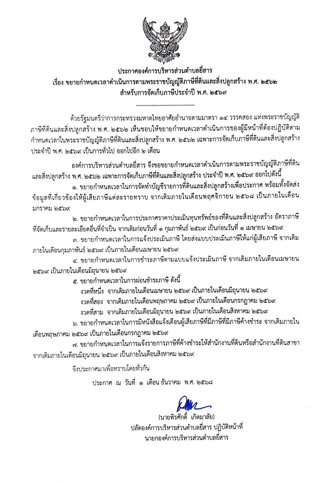 ประกาศองค์การบริหารส่วนตำบลยี่สาร เรื่อง ขยายกำหนดเวลาดำเนินการตามพระราชบัญญัติภาษีที่ดินและสิ่งปลูกสร้าง พ.ศ. 2562 สำหรับการจัดเก็บภาษีประจำปี พ.ศ. 2569